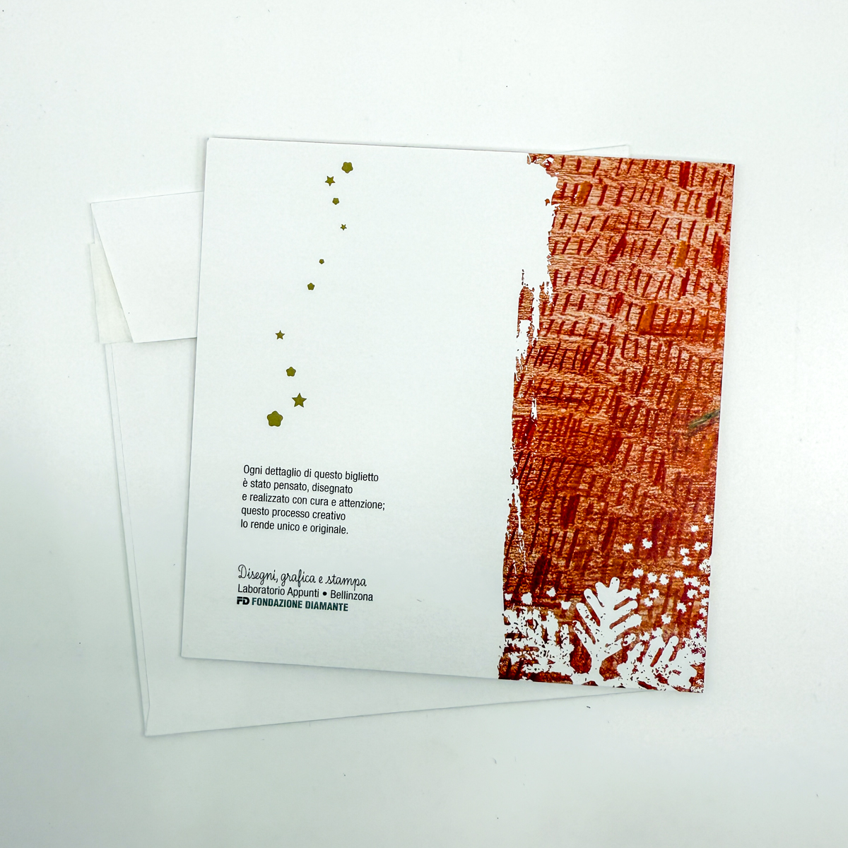 Biglietti di Natale personalizzati. Ogni esemplare nasce da un disegno realizzato a mano e poi perfezionato con delle elaborazioni digitali. I biglietti nel formato chiuso misurano 13 x 13 cm, sono pieghevoli e stampati su un cartoncino bianco naturale di 300g/m². Forniti con la busta coordinata compresa nel prezzo. È possibile personalizzare i biglietti aggiungendo loghi o testi.