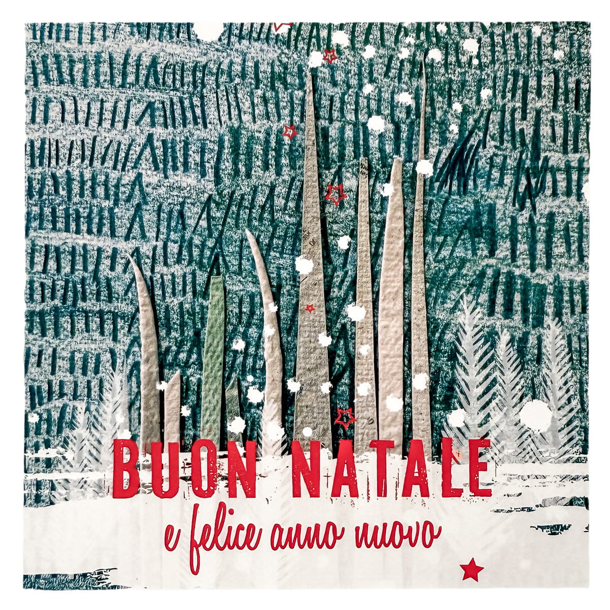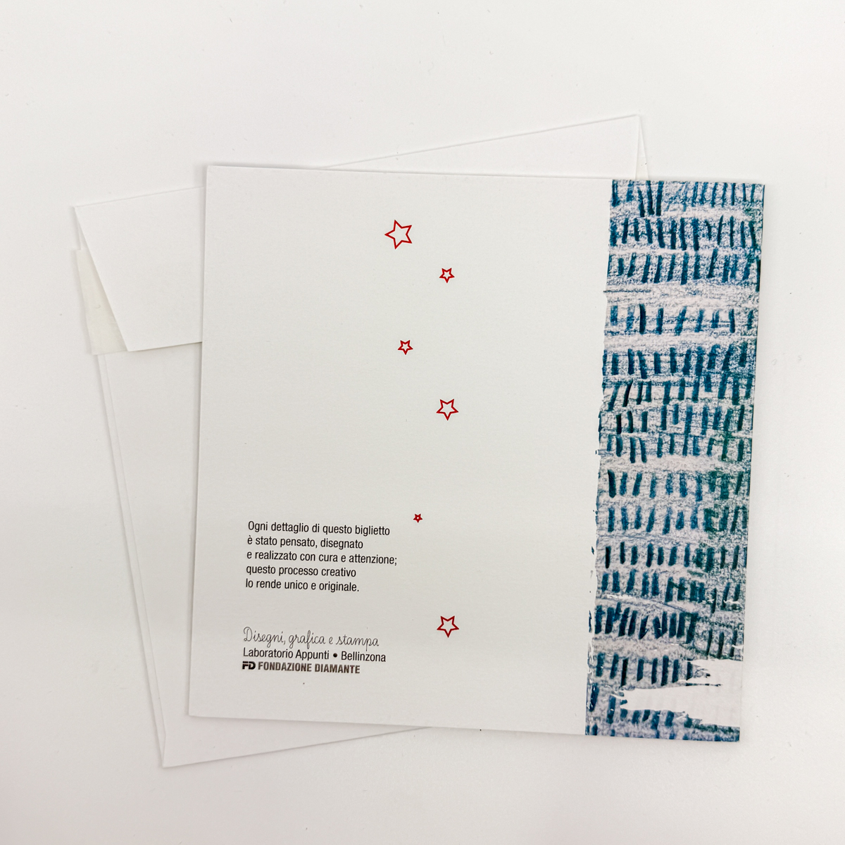 Biglietti di Natale personalizzati. Ogni esemplare nasce da un disegno realizzato a mano e poi perfezionato con delle elaborazioni digitali. I biglietti nel formato chiuso misurano 13 x 13 cm, sono pieghevoli e stampati su un cartoncino bianco naturale di 300g/m². Forniti con la busta coordinata compresa nel prezzo. È possibile personalizzare i biglietti aggiungendo loghi o testi.