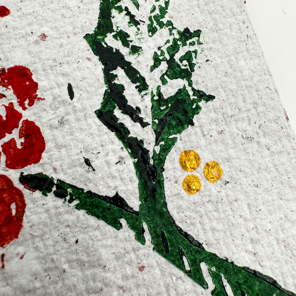 Biglietti augurali realizzati artiginalmente con decorazioni stampate a mano su carta riciclata.