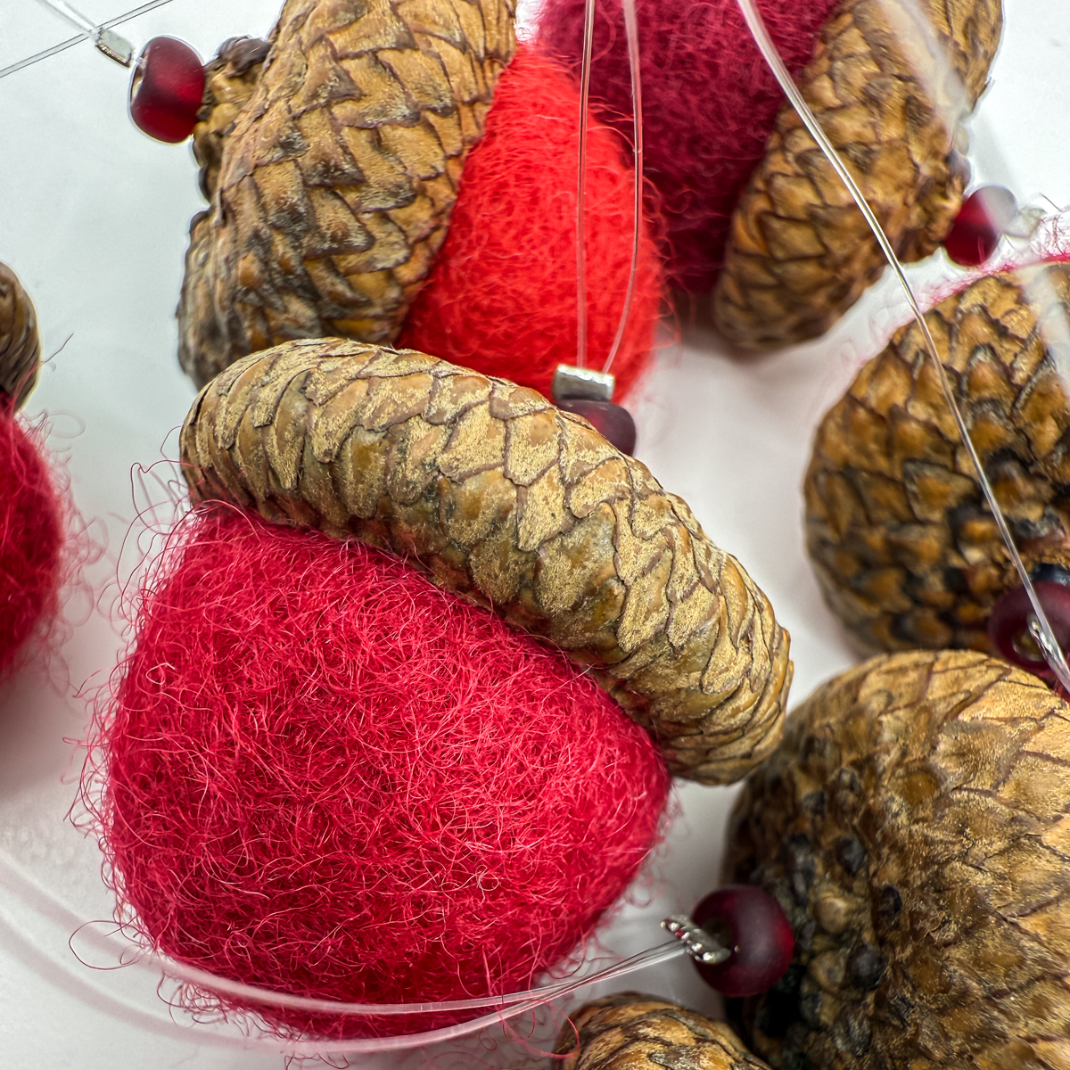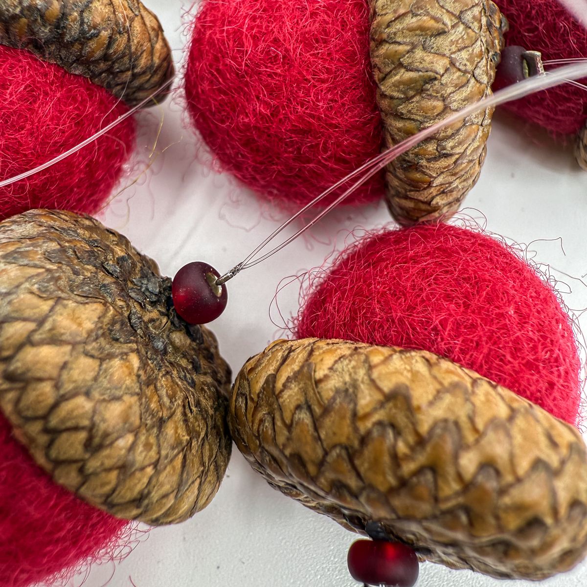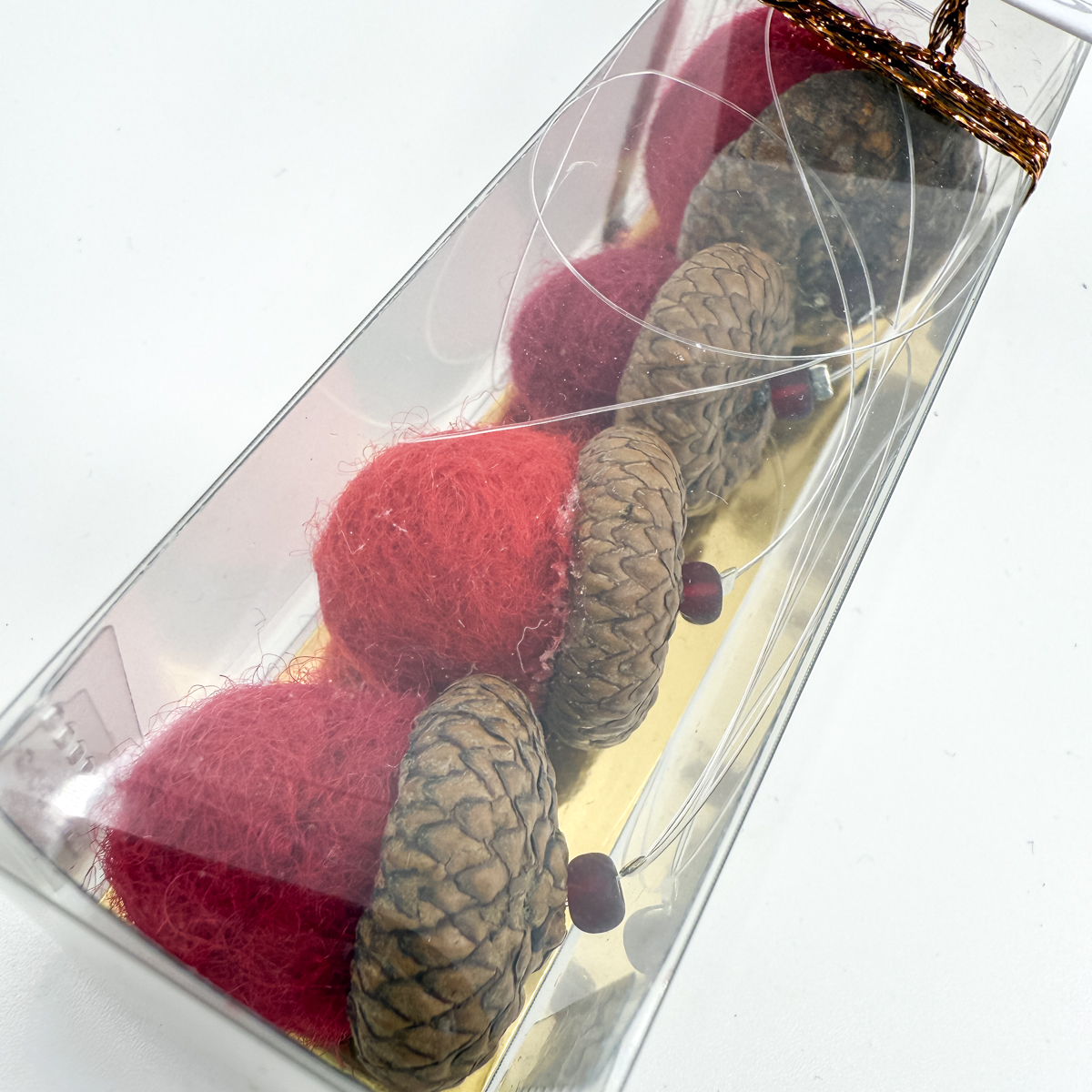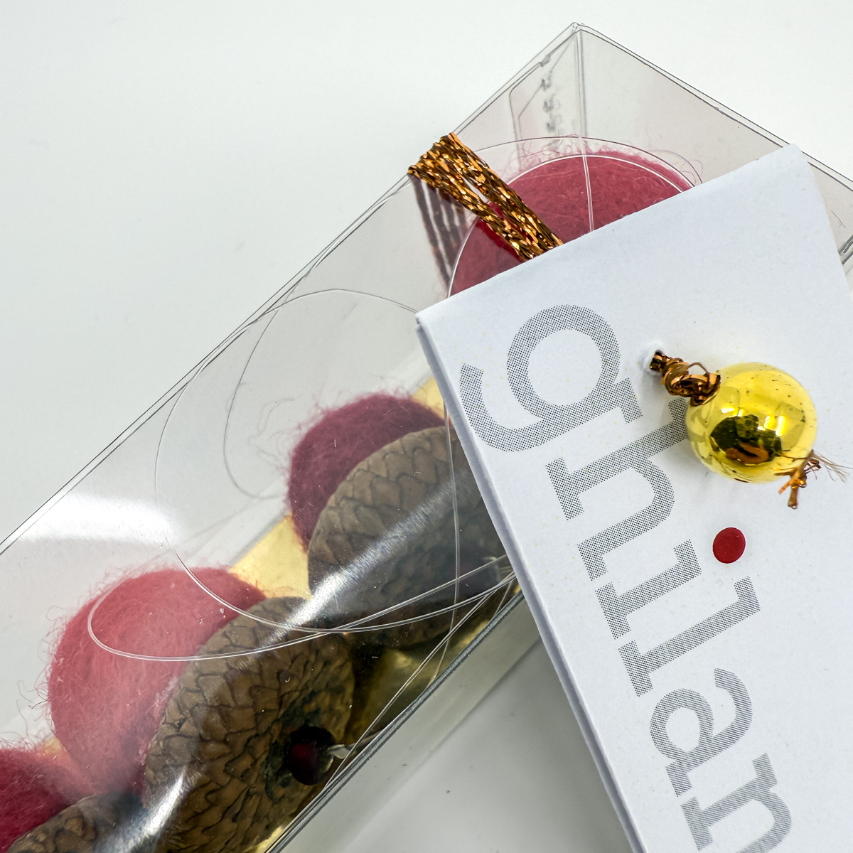 Addobbo Natalizio, ghiande in feltro realizzate a mano, confezione da quattro esemplari 100% Lana, ghiande essiccate, filo nylon per appendere, perlina.